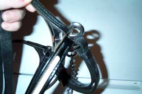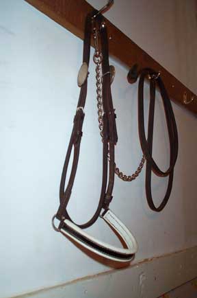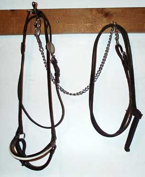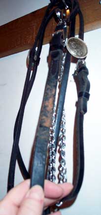 Used Full size Arab show halter Quality Champion brand (stamped) Fine black leather patent leather noseband in black and white one inch, one piece poll strap sterling silver conchos, need buffing (tarnished) no leather chin strap leather lead with long chain good condition $90 |