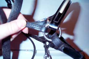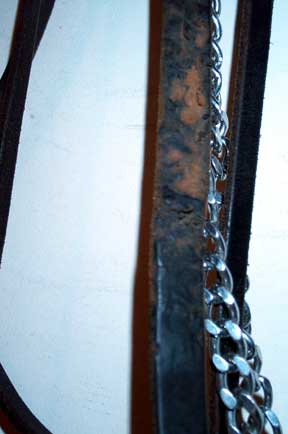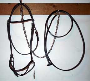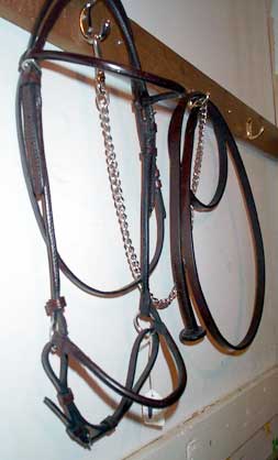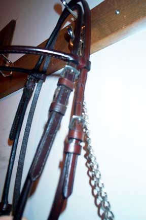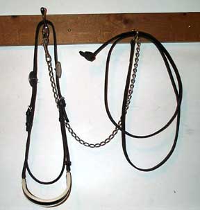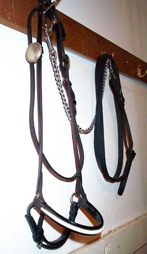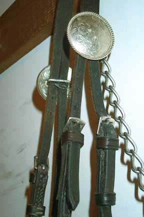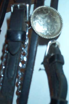 Used Full size Arab show halter Quality Champion brand (stamped) Fine black leather patent leather noseband in black and white one inch, one piece poll strap sterling silver conchos, need buffing (tarnished) no leather chin strap leather lead with long chain good condition $90 |